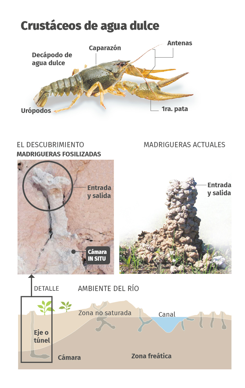 “Estos crustáceos de 70 millones de años se entierran en la arena para buscar el nivel freático del río”, explicó Raúl. Y agregó: “Esos huecos que dejaron, se rellenaron de sedimento y se conservaron hasta el presente, siendo verdaderos indicadores paleo ambientales”.