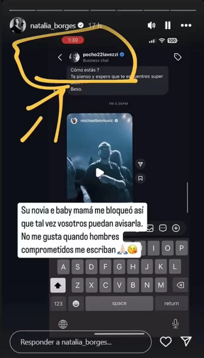 “Él me escribe siempre, todo el tiempo. Intenté avisarle a su novia, pero ella me bloqueó. Me traicionaba con ella y ella siempre lo supo. Siempre estuve callada y respeté su estado. Eso lo hace siempre, no solamente ahora”, le contó Borges al periodista Guido Záffora.