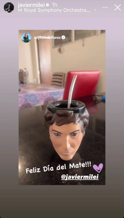 Como cada 30 de noviembre, desde hace una década, se celebra el Día Nacional del Mate, una bebida de profundas raíces argentinas. Es por eso que en consonancia con la próxima asunción presidencial de Javier Milei, este jueves su novia Fátima Florez no tuvo mejor idea que compartir el particular mate que usa por estos días.