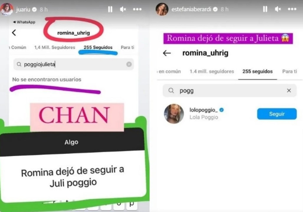 Lo cierto es que en los tiempos que corren, seguir o dejar de seguir a alguien en redes sociales es toda una señal. Entonces, Juariu compartió una captura donde se ve que «Romina dejó de seguir a Juli Poggio» y le agregó un «Chan» gigante en señal de alerta.