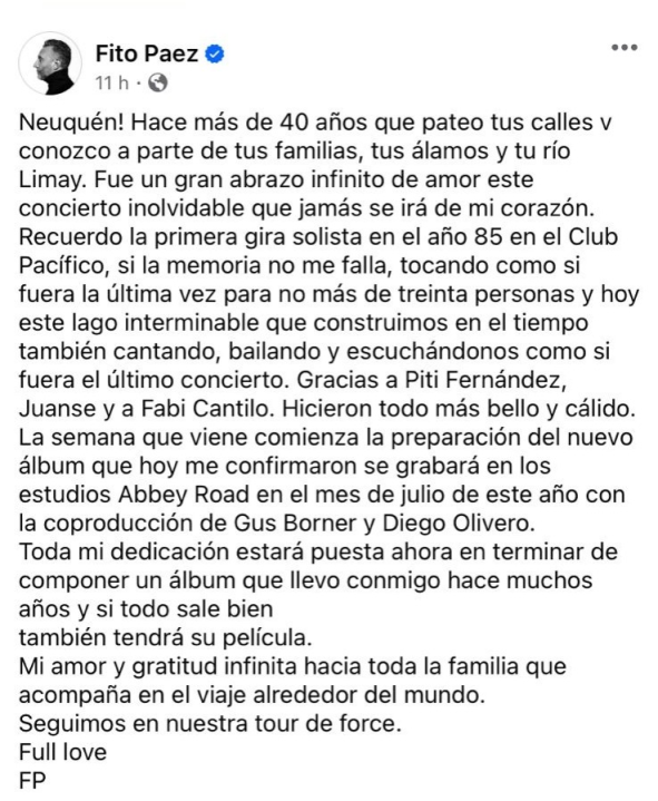 «Neuquén! Hace más de 40 años que pateo tus calles y conozco a parte de tus familias, tus álamos y tu río Limay. Fue un gran abrazo infinito de amor este concierto inolvidable que jamás se irá de mi corazón. Recuerdo la primera gira solista en el año 85 en el Club Pacífico», dijo el compositor de «El amor después del amor».