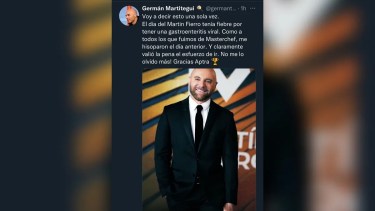 Voy a decir esto una sola vez», arrancó diciendo el jurado de MasterChef Celebrity. «El día del Martin Fierro tenía fiebre por tener una gastroenteritis viral», añadió.