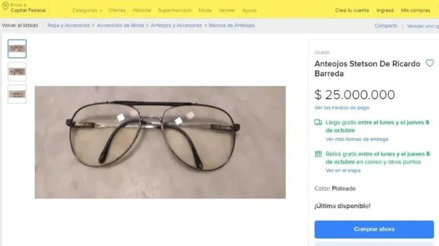 Dos años después decidió venderlo y sorprendió su valor. Está a 25 millones de pesos. “Anteojos pertenecientes al odontólogo Ricardo Barreda. Producto raro e histórico para coleccionistas”, dice la descripción en la plataforma de venta online.