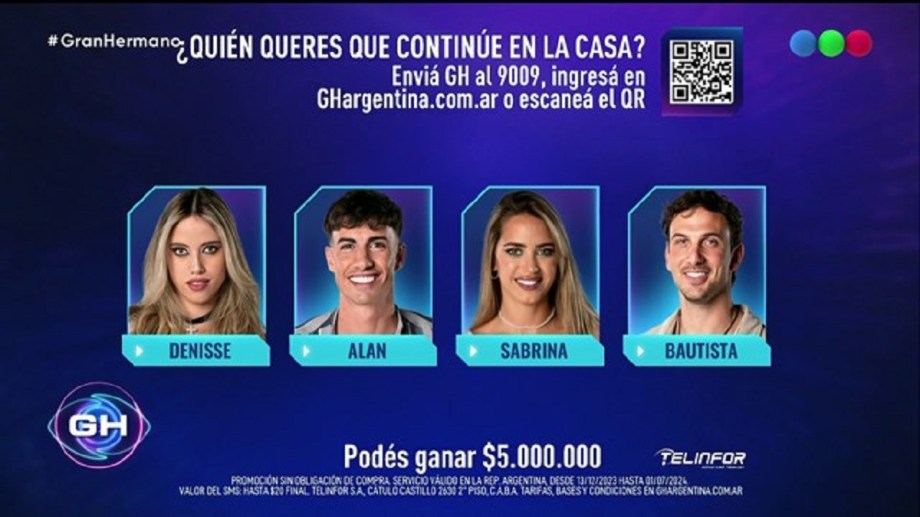 Finalmente, y ya rozando la medianoche, quedaron cuatro jugadores en placa de nominados: Sabrina, Alan, Bautista y Denisse: las dos parejas de la Casa de Gran Hermano.