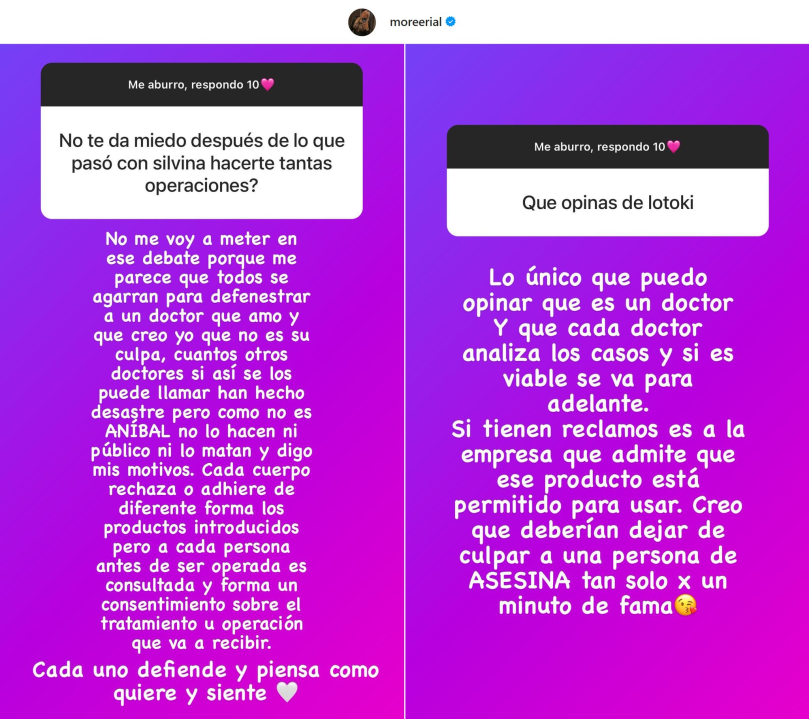 More defendió al cirujano en su cuenta de Instagram ante unas consultas de sus seguidores sobre las cirugías estéticas.