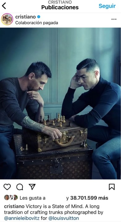 2- Cristiano Ronaldo (@cristiano): El jugador portugués alcanzo los 500 millones de followers y se convirtió en la primera cuenta en alcanzar esta cifra dos días después de publicar una foto de una campaña publicitaria en la que aparece jugando al ajedrez con Leo Messi.