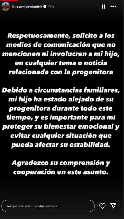 Además en otra historia agregó: «Respetuosamente, solicito a los medios de comunicación que no mencionen ni involucren a mi hijo, en cualquier tema o noticia relacionada con la progenitora. Debido a circunstancias familiares, mi hijo ha estado alejado de su progenitora durante todo este tiempo, y es importante para mi proteger su bienestar emocional y evitar cualquier situación que pueda afectar su estabilidad. Agradezco su comprensión y cooperación en este asunto»