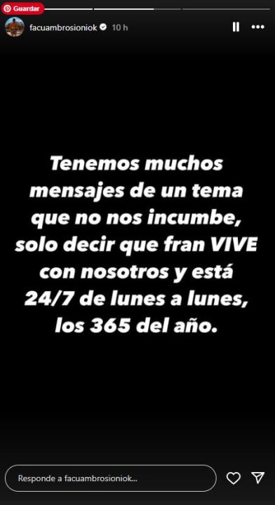 Ante esa noticia su exnovio y padre de su hijo mayor, Facundo Ambrosioni, se expresó en redes sociales para desligarse por completo de la situación. El padre de Francesco, dejó un mensaje en redes, que decía: «Tenemos muchos mensajes de un tema que no nos incumbe, solo decir que Fran vive con nosotros y está 24/7 de lunes a lunes, los 365 días del año»