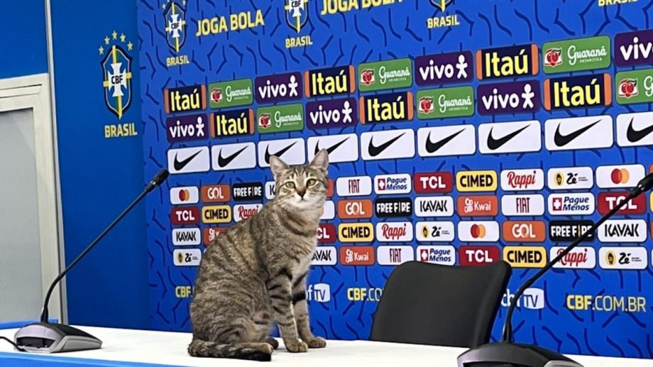 Es que, en una conferencia de prensa, las cámaras captaron el momento exacto en que el jefe de prensa de Brasil Vinicius Rodrigues retiró a un gato pardo de la mesa de conferencia, donde Vinicius JR. iba a hacer declaraciones sobre los resultados deportivos de su equipo.