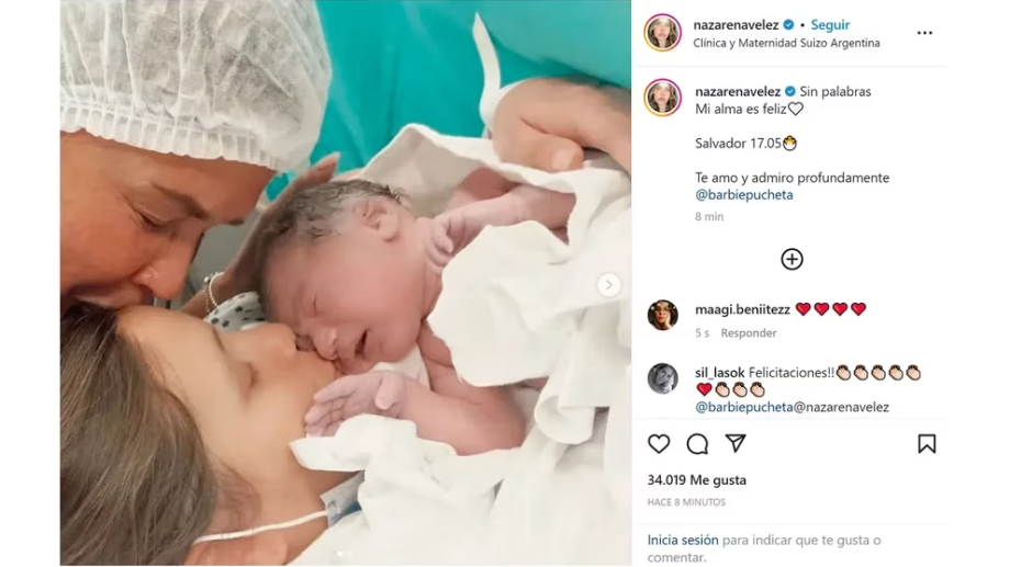 La productora se mostró desde el sanatorio con la cofia reglamentaria, dando a entender que el nacimiento era inminente. Y un par de horas después, subió a sus redes dos emotivas imágenes de uno de los días más felices de su vida: una foto con el pequeño Salvador, observándolo con una mirada en la que transmitía todo su amor. Y otra con su hija y su nieto