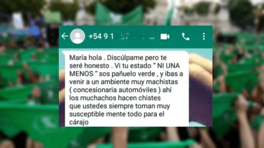 “María, hola. Disculpame, pero te seré honesto. Vi tu estado “Ni una menos”, sos pañuelo verde e ibas a venir a un ambiente muy machista (concesionaria de autos). Ahí los muchachos hacen chistes que ustedes siempre toman muy susceptiblemente, todo para el carajo”, fue el repudiable inicio del chat.