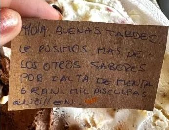 Si bien los trabajadores del comercio le enviaron una carta con las disculpas del caso, eso no alcanzó para la antojadiza usuaria. «Hola buenas tardes, le pusimos más de los otros sabores por la falta de menta granizada. Mil disculpas» decía el papelito, adjuntado al pote de helado.