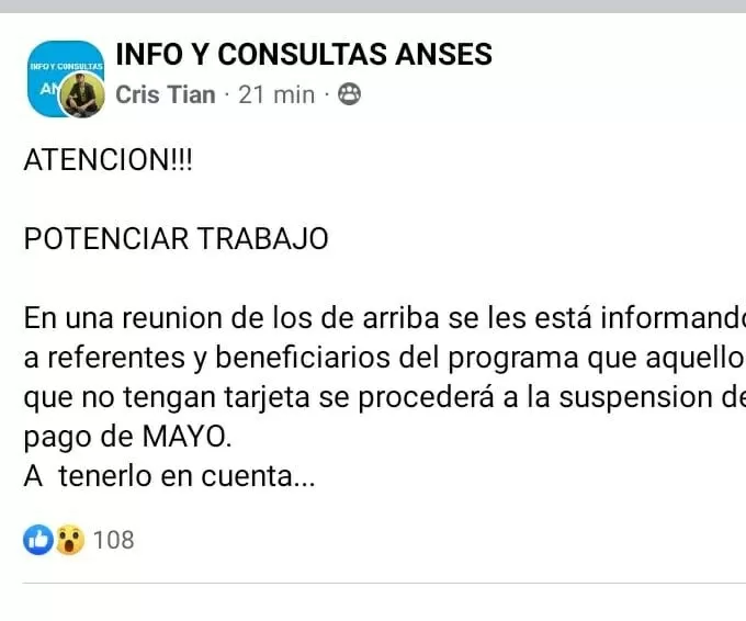 Según la falsa información viralizada en redes sociales, el Ministerio de Desarrollo Social procedería con la suspensión del programa Potenciar Trabajo para quienes no tengan la tarjeta de la entidad bancaria correspondiente.