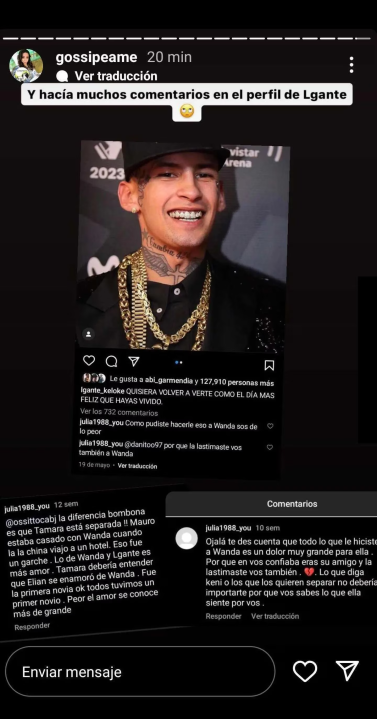 En los mensajes, Wanda Nara aclaraba sus sentimientos hacia L-Gante. “Ojalá te des cuenta que todo lo que le hiciste a Wanda es un dolor muy grande para ella. Porque en vos confiaba, eras su amigo y la lastimaste”, expresaba en un comentario.