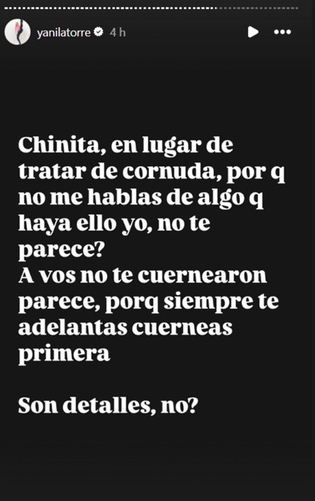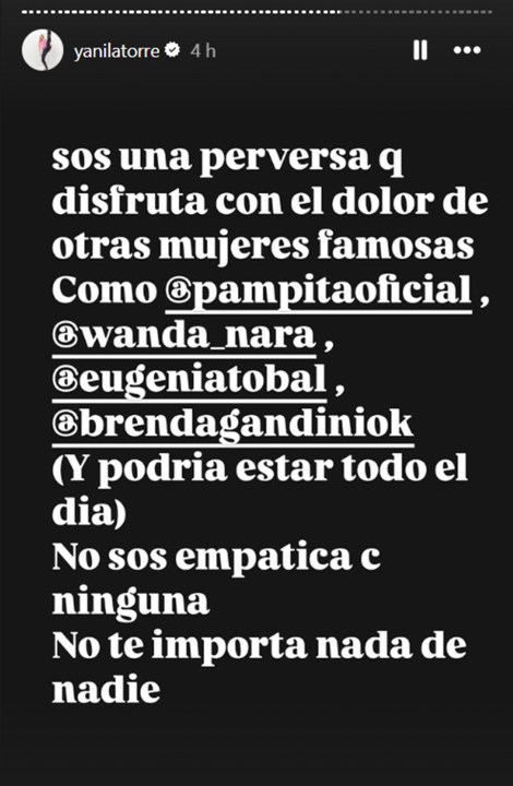 En sus historias de Instagram, Yanina Latorre señaló que China Suárez es «una perversa» que «disfruta del dolor de otras mujeres famosas». Y la panelista enumeró: «como Pampita, Wanda Nara, Eugenia Tobal y Brenda Gandini«, mencionando a cada una de ellas.