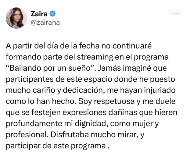 “A partir del día de la fecha no continuaré formando parte del streaming en el programa Bailando por un sueño”, escribió Zaira Nara en su cuenta de Twitter.