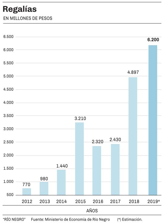Fuentes del ministerio de Economía de Río Negro indicaron que la estimación se hizo mes a mes con una cotización a futuro que lleva la valoración del dólar hasta los 60 pesos. Esto representa un 26% de incremento en relación con los 4.893 millones que se recaudaron en 2018 una cifra récord que duplicó el monto con respecto a 2017.