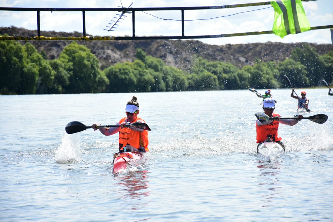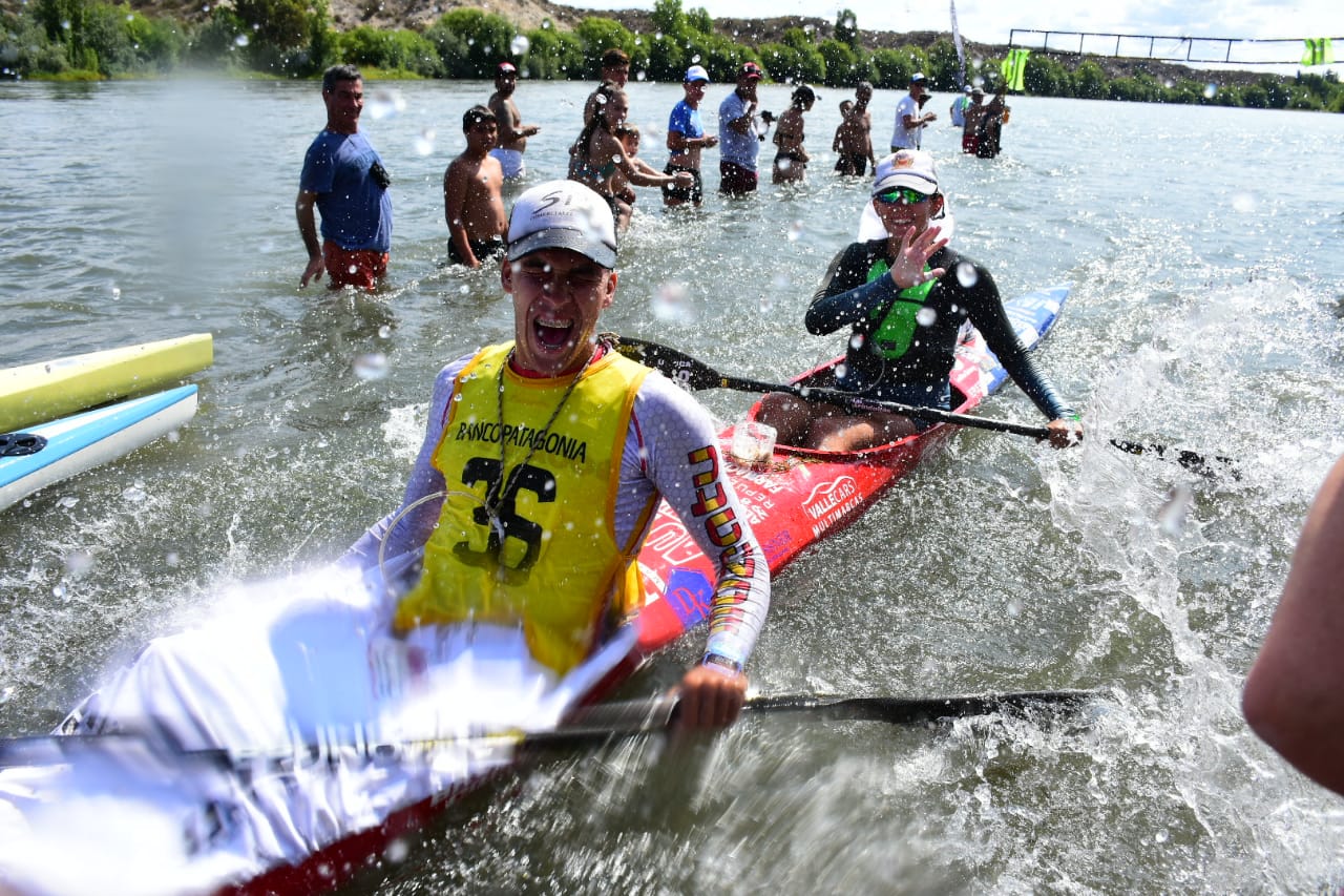 Los palistas Néstor Pinta y su hijo Damián (N°1) ganaron el sprint final, este lunes, de la tercera etapa por la Regata del río Negro. Pasadas las 16, superaron la línea de llegada y celebraron el triunfo en familia.