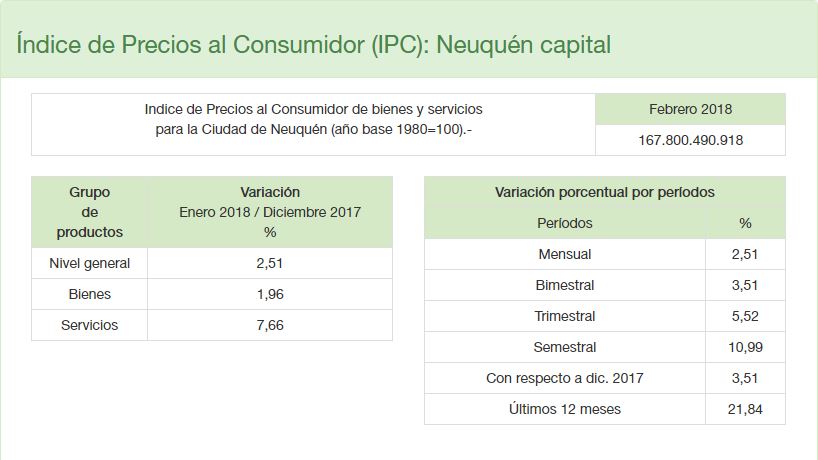 La Dirección Provincial de Estadísticas y Censos de la provincia de Neuquén publicó los resultados del Índice de Precios del Consumidor (IPC) del mes de febrero de 2018 en la cuidad de Neuquén.