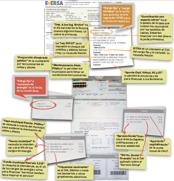 Tasas municipales, impuestos nacionales y provinciales, aportes cooperativos y hasta otros servicios engordan el precio de las boletas que llegan a los hogares.