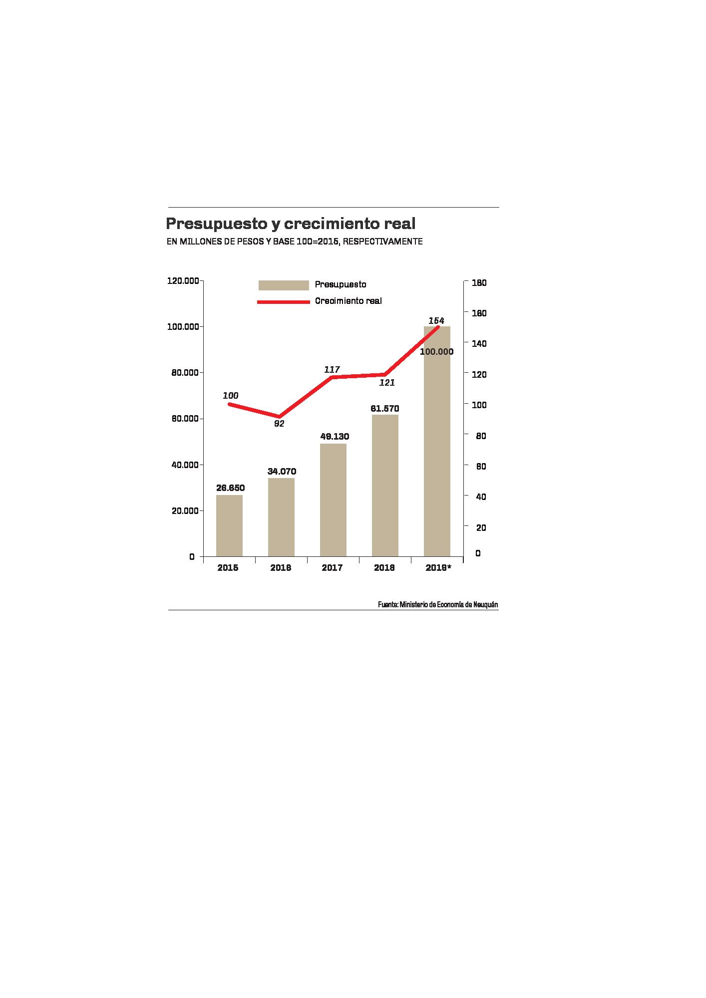 Los 100.000 millones de pesos que la administración Gutiérrez proyecta erogar durante el año que viene representan todo un récord para la joven economía neuquina. Refleja un crecimiento, respecto del proyecto del corriente año, de más del 60%. Una variación significativa teniendo en cuenta que el costo de vida para el 2019 se estima en la mitad. En valores nominales representa unos 40.000 millones de pesos adicionales. En términos reales, si se le quita el efecto inflación proyectado para el próximo año, las arcas provinciales sumarán alrededor de 25.000 millones de pesos.