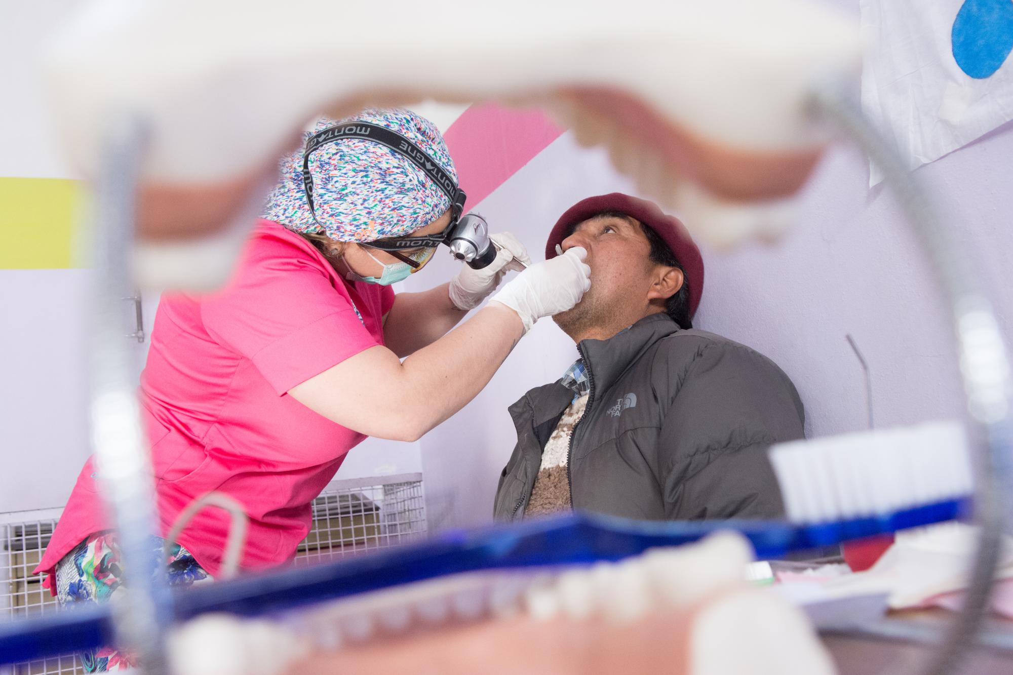 Del vehículo bajan cuatro docentes, nueve alumnos, dos colaboradores, todos emponchados para hacerle frente a la temperatura bajo cero. Enseguida empiezan a bajar el instrumental que necesitarán para montar en el salón principal de la escuela y en un aula, dos salas de atención. Afuera, el consultorio móvil es el orgullo de todos: tiene dos espacios con absolutamente todo, incluido rayos X, tornos y hasta un equipo de frío/calor.