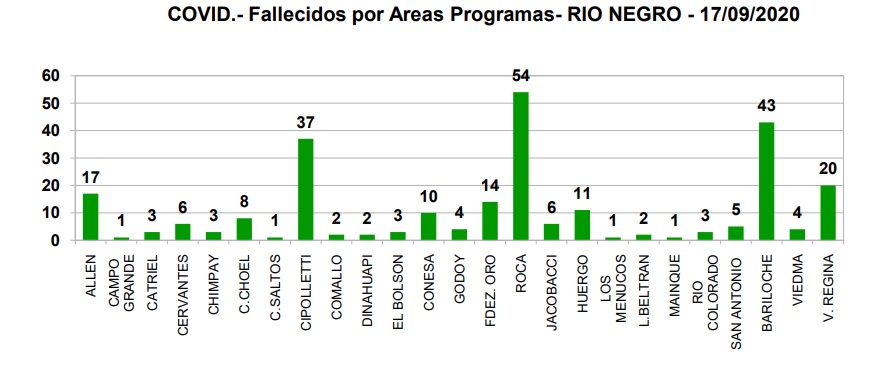 No obstante, la ciudad más poblada del Alto Valle tiene un mayor número de fallecidos, con 54 personas que perdieron la vida luego de haberse enfermado. En Bariloche esas víctimas eran 47 hasta ayer.