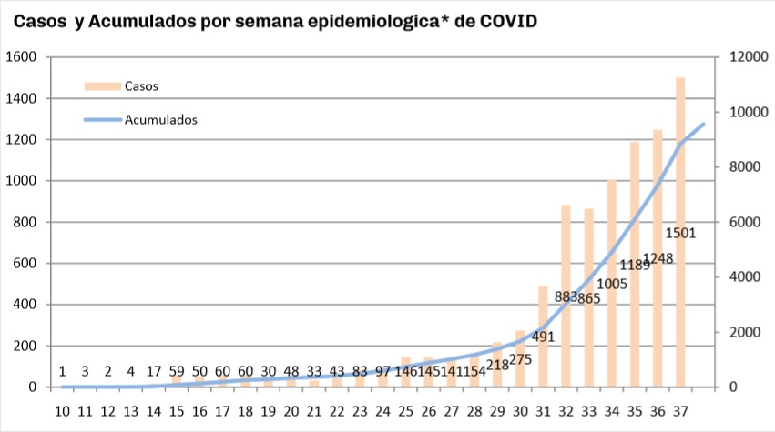 La curva con la evolución del coronavirus aparece por estas horas -transitando la semana epidemiológica 38- con una leve tendencia a la meseta, pero ese dato no permite todavía pensar en un alivio. Durante los últimos 50 días el ascenso fue constante, llegando la semana pasada a un récord: 1.501 nuevos casos (el 15% del total acumulado en seis meses y medio) en apenas siete días.