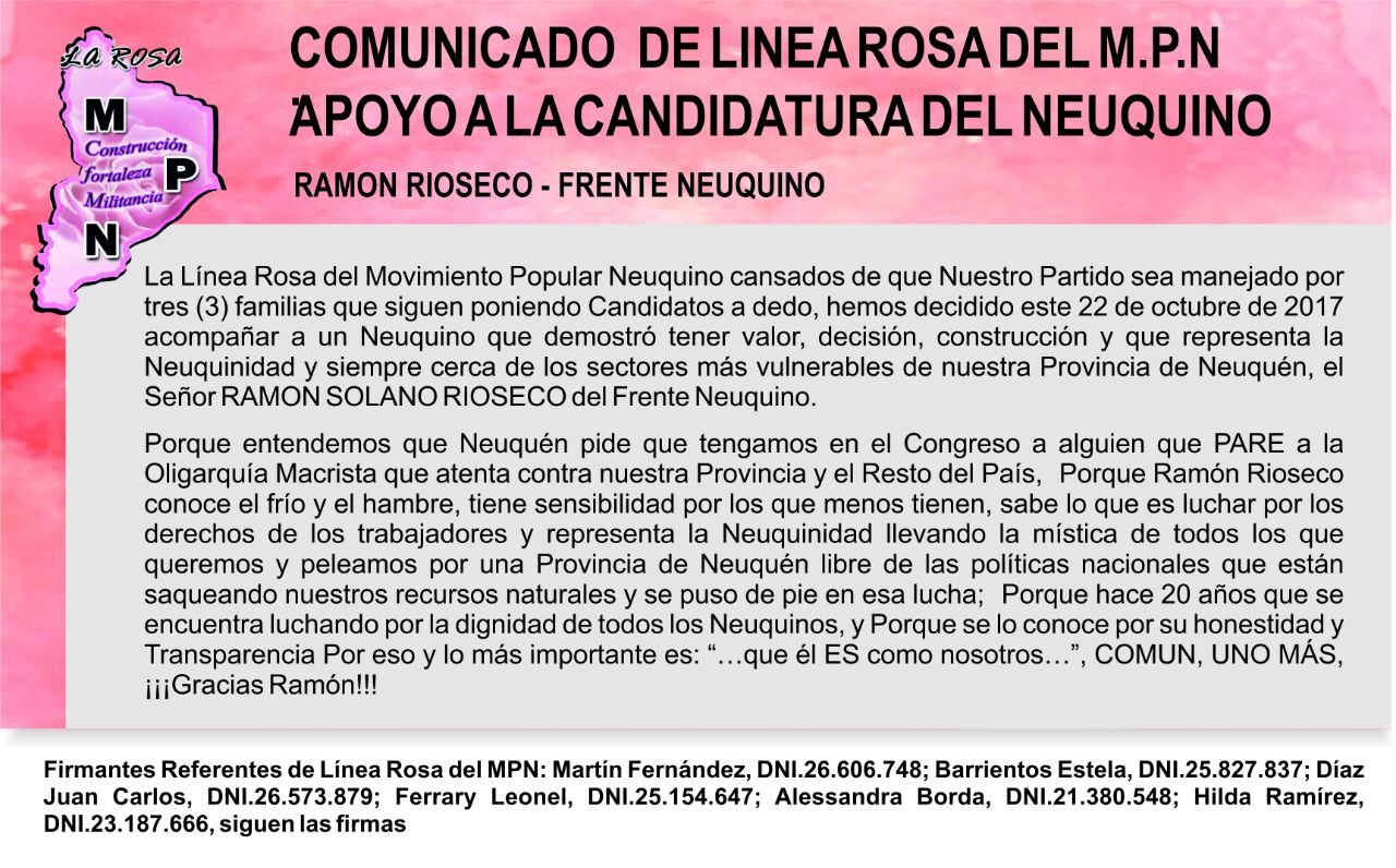 “Cansados de que nuestro partido sea manejado por tres familias que ponen candidatos a dedo, hemos decidido este 22 de octubre de 2017 acompañar a un neuquino que demostró tener valor, decisión, construcción y que representa la neuquinidad” afirmaron desde la “Línea Rosa”.