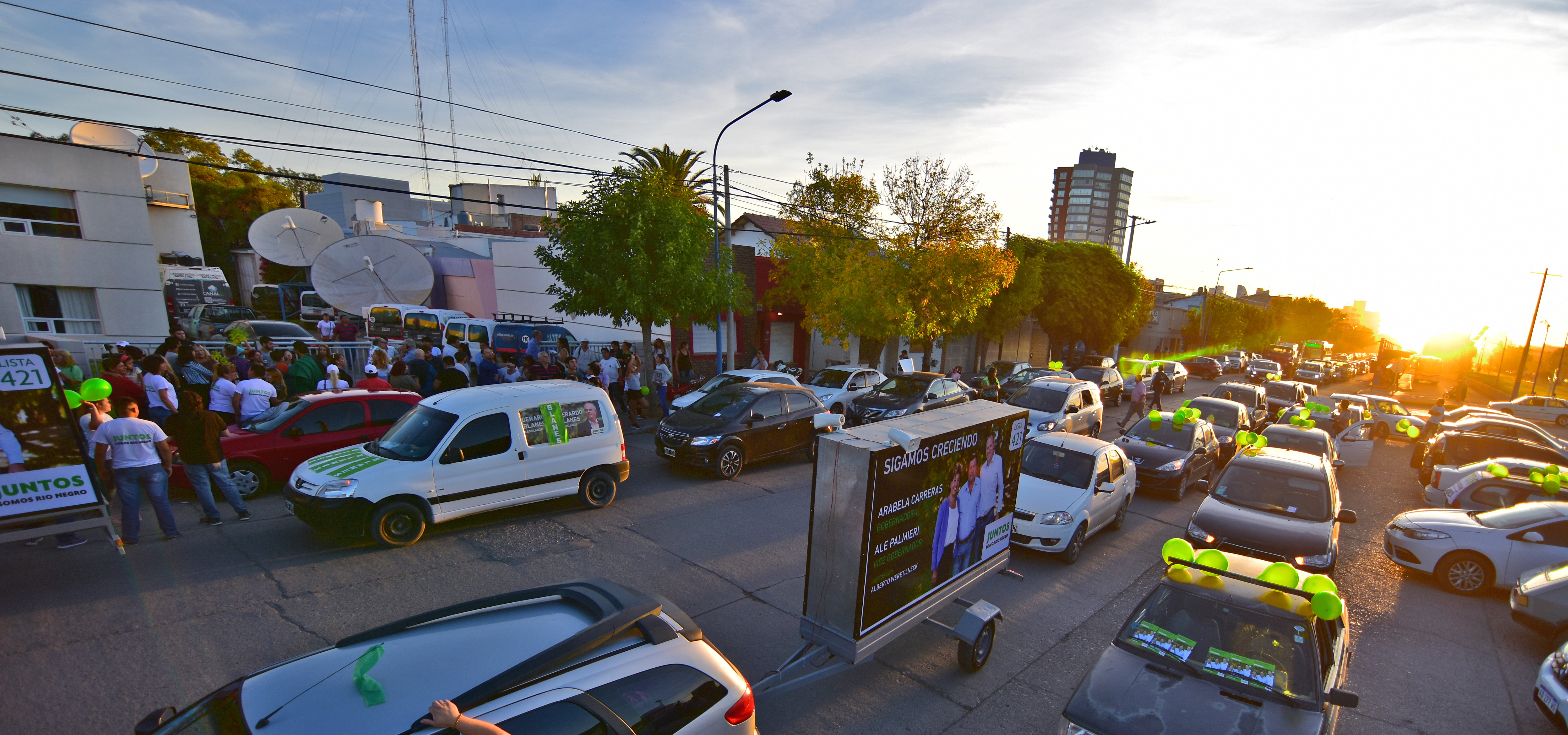 Juntos Somos Río Negro realizó una caravana de vehículos por Roca para dar cierre a su campaña electoral. Con globos verdes y carteles pegados en los autos, sus simpatizantes acompañaron al candidato a vice gobernador, Alejandro Palmieri por los barrios de la localidad.