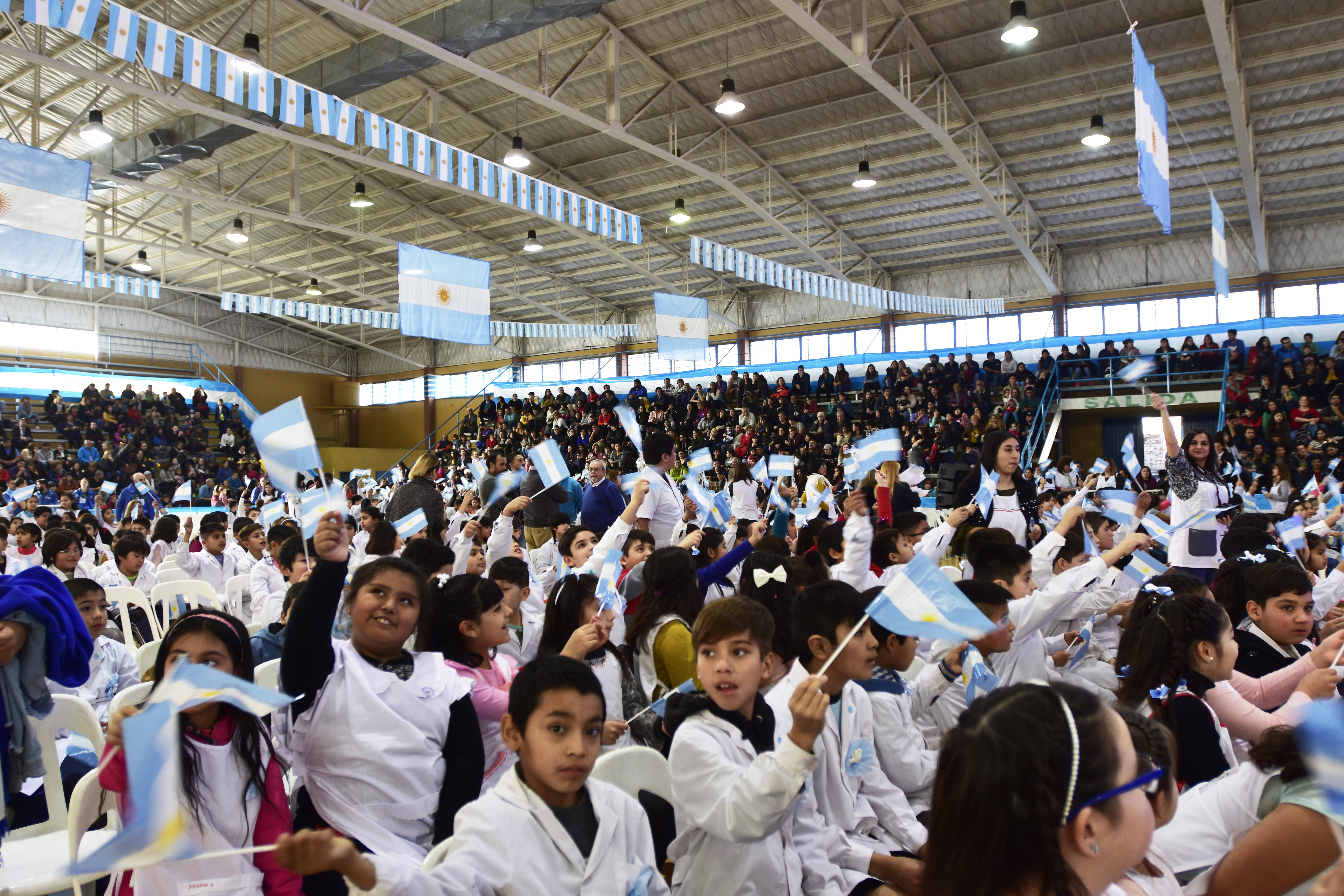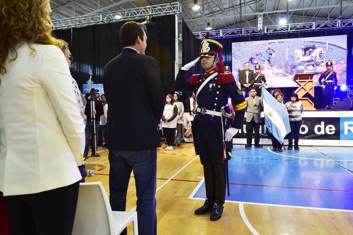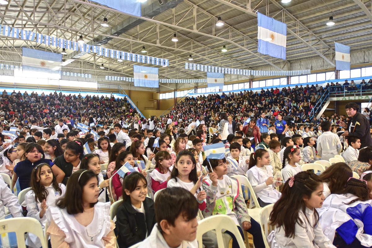 Hace minutos finalizó el tradicional acto en Roca. Más de 700 alumnos y alumnas prometieron la bandera en el polideportivo Gimena López.