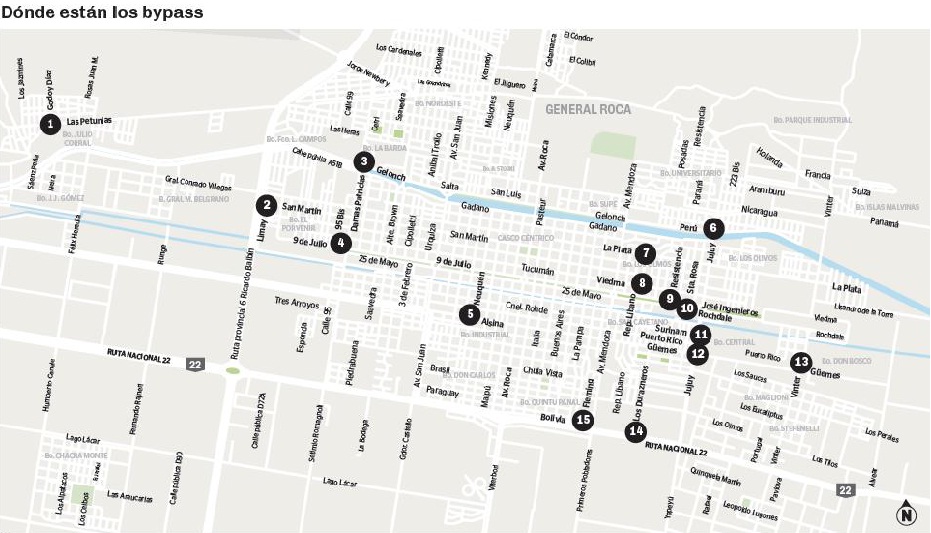 En la otra punta de Roca, en barrio Alta Barda también se colocó un by pass, dado los múltiples problemas de aguas servidas en las calles. Otros más antiguos están ubicados en Mendoza y Bolivia y en cercanías de Ruta 22 y Durazneros, según comentaron operarios de la empresa Arsa.