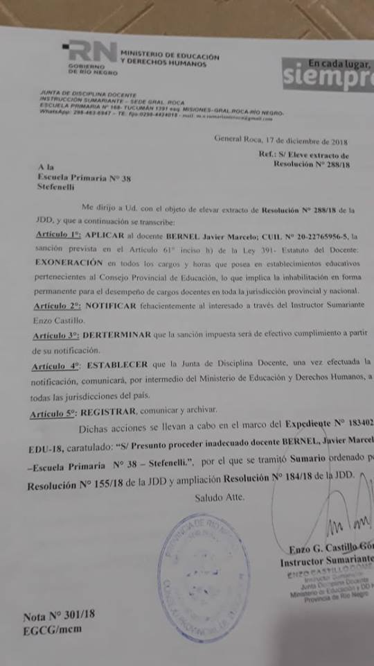 En la Resolución 288/18 se estableció que la sanción para el docente imputado por abuso sexual simple a alumnas, Javier Marcelo Bernel, sería la de “exoneración en todos los cargos y horas que posea en establecimientos educativos pertenecientes al Consejo Provincial de Educación (…) y en toda la jurisdicción provincial y nacional”.