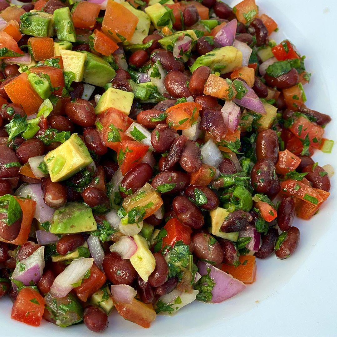 Dividir los tomates perita en 4 gajos, quitarles el centro y cortar en cuadrados de 1 cm x 1 cm. Cortar la palta hacia la mitad, quitar el carozo y la piel. Cortar en cuadrados de 1 cm x 1cm. Picar la cebolla morada en cuadrados pequeños y la cebolla de verdeo en rojadas de 1 mm. En un bol mezclar los porotos, el tomate, la palta, la cebolla de verdeo y cebolla morada, perejil picado y cilantro picado. Agregar el jugo del limón, aceite de oliva, sal marina y mezclar.