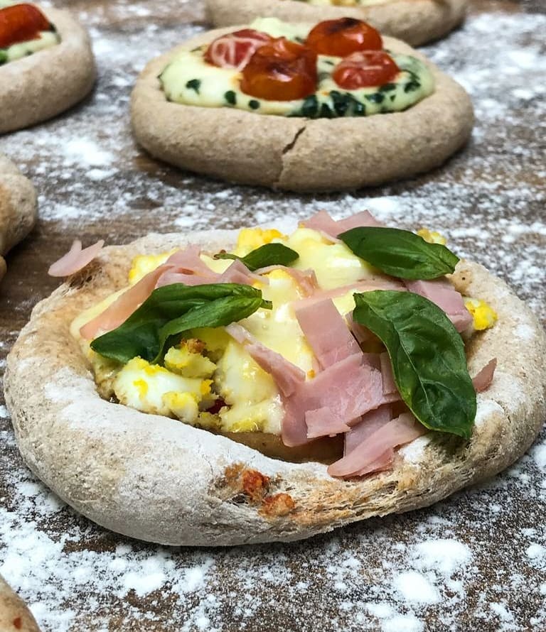 5. Y para la cubierta 3: Hacer un puré de berenjenas. Cubrir la pizza de base jamón cocido en tiras, huevo duro, mozzarella, el puré y si querés, morrón quemado le queda riquísimo.