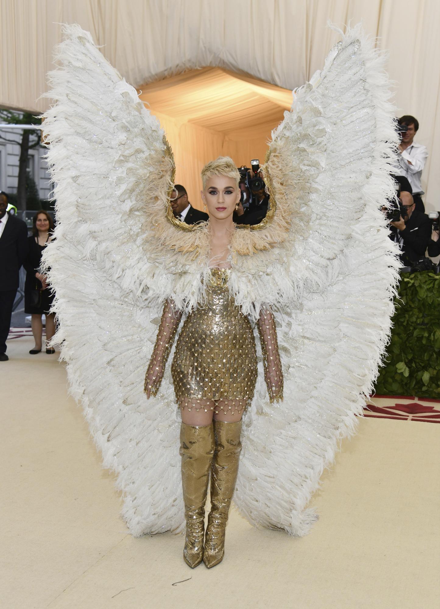 Katy Perry estuvo a la altura con un angelical y exuberante par de alas enorme, botas metálicas y un vestido de Versace. Tras deslumbrar en la alfombra, la estrella pop se vio obligada pasar de lado por la puerta para que las alas de más de 1,80 metro entraran.