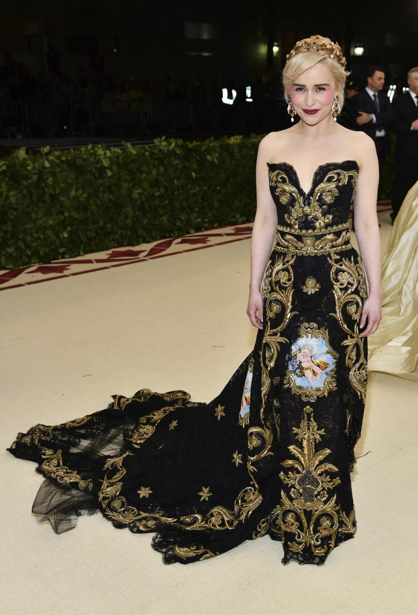 Las estrellas abordaron el código de vestimenta con elaborados tocados, mares de oro resplandeciente y, por supuesto, muchas cruces. Emilia Clarke optó por un vestido de Dolce & Gabbana negro y dorado, con querubines.