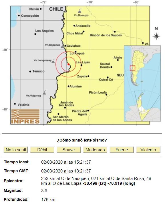 Esta tarde se registró un sismo en cercanías a Las Lajas, sobre la cordillera, en el límite con Chile. Los últimos eventos similares en el norte neuquino ocurrieron hace casi dos semanas, el 18 de febrero.