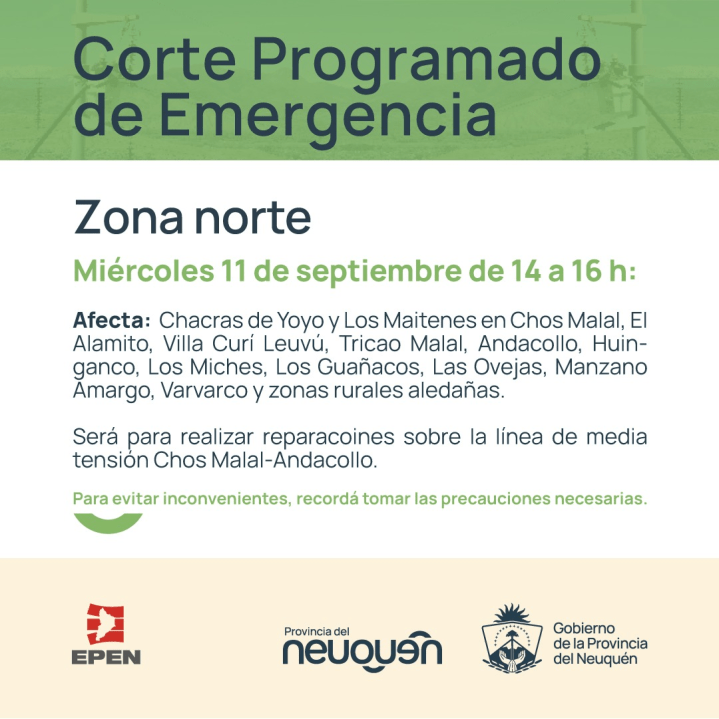 El Ente Provincial de Energía del Neuquén (EPEN) anunció un corte de luz para este miércoles en Chacras Yoyo y Los Maitenes (Chos Malal), El Alamito, Villa Curi Leuvú, Tricao Malal, Andacollo, Huinganco, Los Miches, Los Guañacos, Las Ovejas, Manzano Amargo, Varvarco y zonas rurales aledañas.