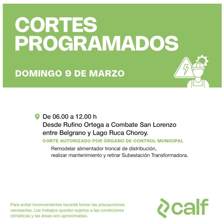 CALF comunicó que la interrupción al servicio será este viernes 7 desde las 7:30 hasta las 12:30, y en el caso del domingo 9 desde las 6 hasta las 12.