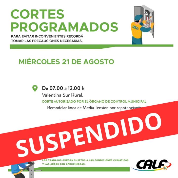 La cooperativa Calf había anunciado un corte de luz en zona de Valentina Sur Rural para este miércoles de 07:00 a 12:00. Sin embargo esta mañana anunciaron la suspensión del mismo.