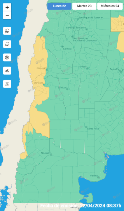Se detalló que el área será afectada por lluvias, pudiendo ser localmente fuertes. Se estiman valores de precipitación acumulada entre 10 y 25 mm, que pueden ser superados de forma puntual. En las zonas más elevadas no se descartan precipitaciones en forma de lluvia y nieve mezclada.