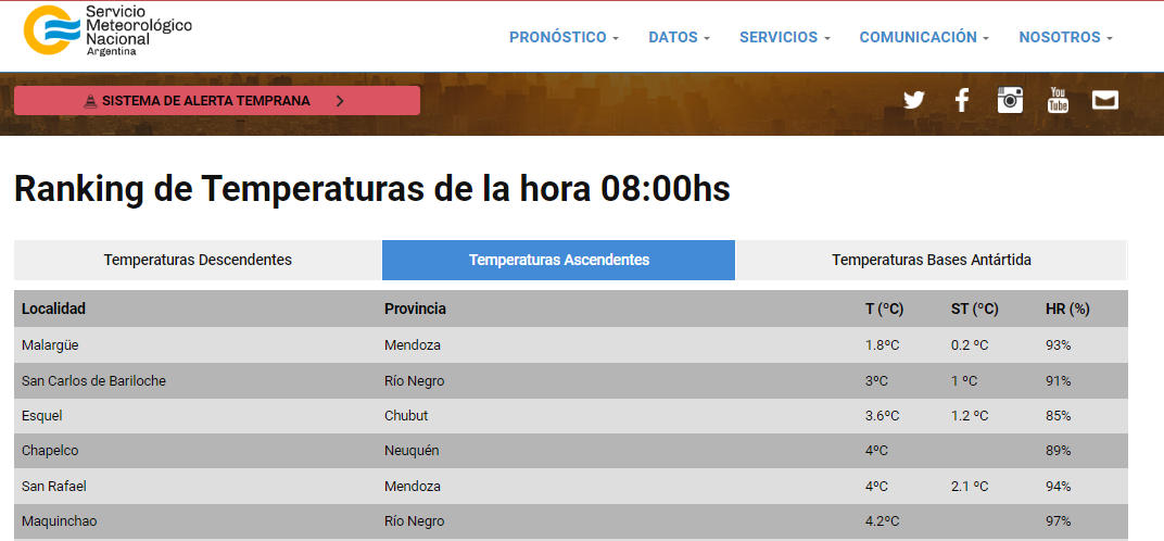El Servicio Meteorológico Nacional (SMN) informó cuáles fueron las temperaturas en todo el territorio nacional, con un dato que indica una baja de la sensación térmica que se acercó los 0 grados y algunas ciudades de nuestra región fueron protagonistas. Cómo quedó el ranking y cuál fue la localidad más fría.