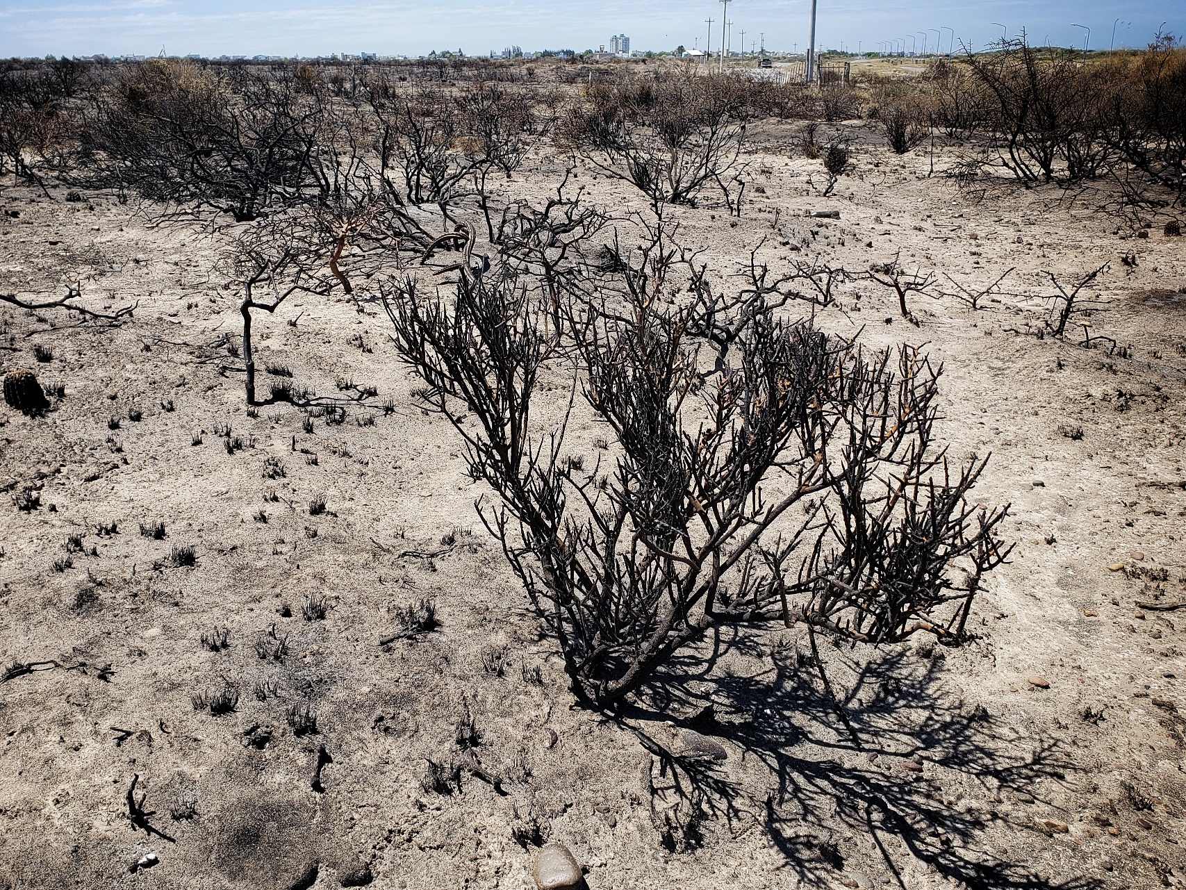 48 horas de labor ininterrumpida. Así quedó la vegetación, tras las llamas en Las Grutas. Foto: Martín Brunella.