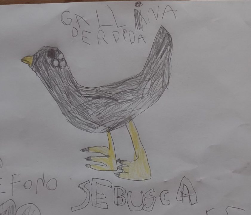La nena perdió su gallina y, como no lograba encontrarla, la dibujó y agregó un número de teléfono, para que si alguien la veía les diera aviso. El dibujo se difundió porque, a comienzos de mayo, el papá lo publicó en un grupo de Facebook que se llama “Mascotas Junín de los Andes”.