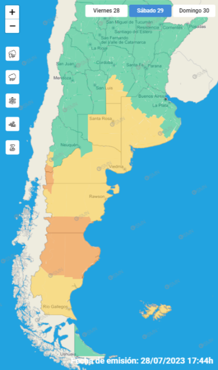 La advertencia para ambas provincias, que también incluye un nivel amarillo, se da en paralelo a la que abarca a la zona andina de Neuquén y Río Negro, por intensas precipitaciones y ráfagas este fin de semana.