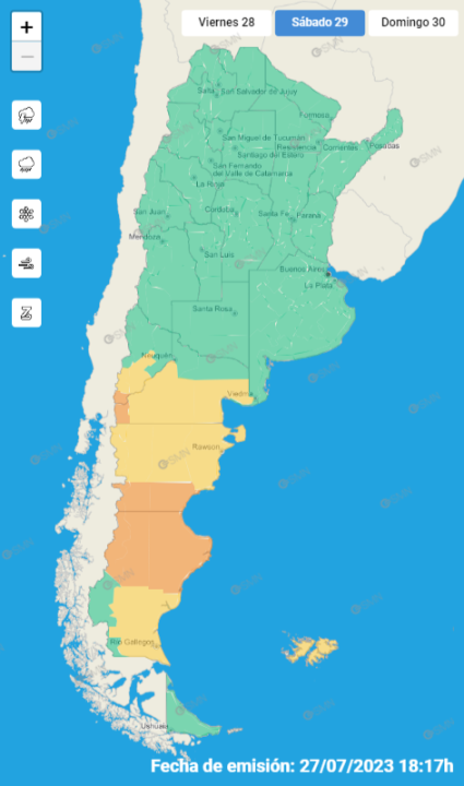 En el caso del viento se espera que sean intensos y del sector norte que rotarán hacia el sector oeste el día sábado 29, con velocidades entre 60 y 75 km/h, y ráfagas que pueden superar los 90 km/h.