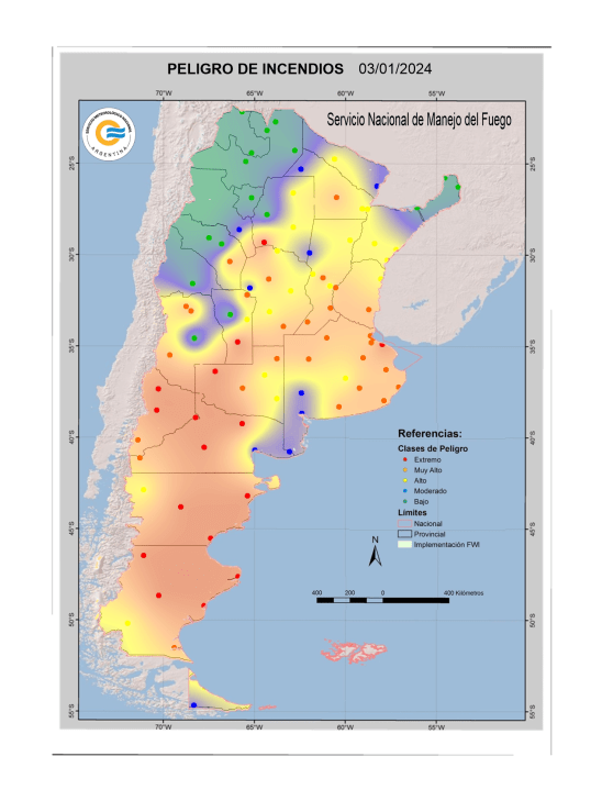 Teniendo en cuenta que las condiciones son favorables para que el fuego comience fácilmente y además sea muy difícil de controlar, el SMA otorgó el color naranja para graficar como «muy alto» el riesgo de incendios.