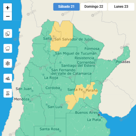 Según informa el SMN, este sábado hay una alerta amarilla por tormenta para parte de Salta, parte de Jujuy, Córdoba, Santa Fe y Entre Ríos.