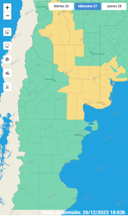 El Servicio Meteorológico Nacional (SMN) emitió una nueva alerta amarilla por tormentas para todo el sector este de la provincia de Río Negro. Se espera la caída de abundantes precipitaciones y actividad eléctrica en las principales localidades, como Viedma, San Antonio y Las Grutas.